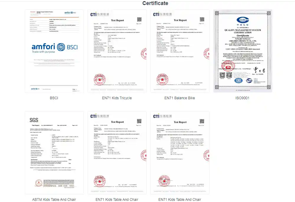 การรับรองเช่นEN71และมาตรฐาน มาตรฐาน ASTMแสดงว่าของเรารถสามล้อเด็กและเด็กเล็ก เพราะได้ผ่านการทดสอบเฉพาะทางแล้วว่าวัสดุไม่มีสารพิษ มุมจะบาดมือหรือไม่ และชิ้นส่วนแน่นหนาและได้มาตรฐานความปลอดภัยหรือไม่